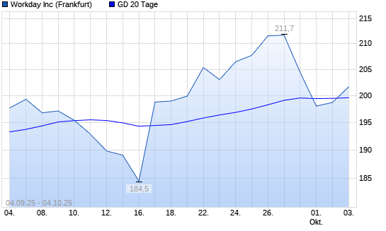 Mit dem Rücksetzer auf 199,82 EUR hat die Workday-Aktie am 03.10.2025 die 20-Tage-Linie nach unten gekreuzt.