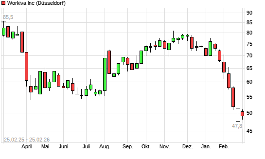 Mit dem Rücksetzer auf 48,40 EUR hat die Workiva-Aktie (ISIN US98139A1051) am 24.02.2026 ein neues 5-Jahres-Tief erreicht und damit den Kurs vom 19.02.2026 eingestellt.