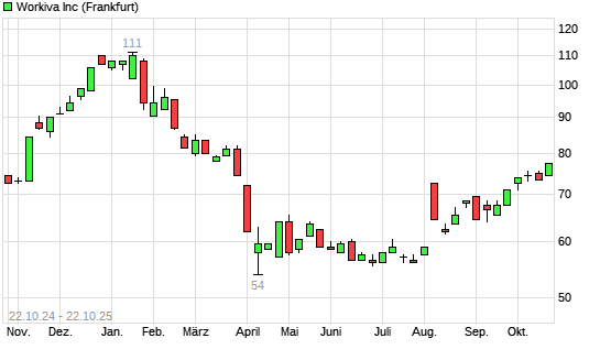 Mit dem Anstieg auf 76,50 EUR hat die Workiva-Aktie (ISIN US98139A1051) am 21.10.2025 ein neues 6-Monats-Hoch erreicht und damit den Kurs vom 07.10.2025 eingestellt.