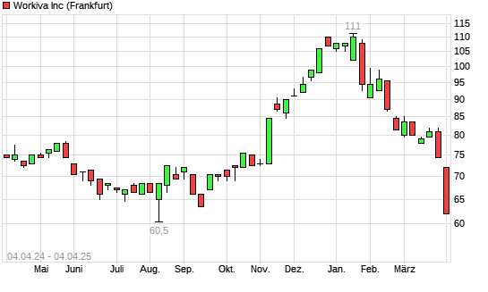 Mit dem Rücksetzer auf 68,50 EUR hat die Workiva-Aktie (ISIN US98139A1051) am 03.04.2025 ein neues 6-Monats-Tief erreicht und damit den Kurs vom 09.10.2024 eingestellt.
