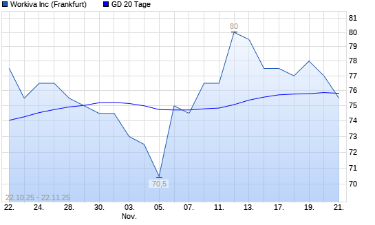 Mit dem Rücksetzer auf 76,00 EUR hat die Workiva-Aktie am 21.11.2025 die 20-Tage-Linie nach unten gekreuzt.