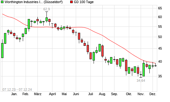 Mit dem Rücksetzer auf 38,34 EUR hat die Worthington Industries-Aktie am 06.12.2024 die 100-Tage-Linie nach unten gekreuzt.