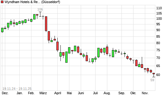 Mit dem Rücksetzer auf 59,50 EUR hat die Wyndham Hotels & Resorts-Aktie (ISIN US98311A1051) am 18.11.2025 ein neues 12-Monats-Tief erreicht und damit den Kurs vom 17.11.2025 eingestellt.