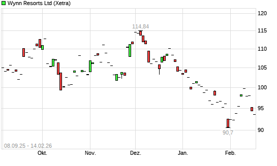 Mit dem Rücksetzer auf 85,83 EUR hat die Wynn Resorts-Aktie (ISIN US9831341071) am 13.02.2026 ein neues 6-Monats-Tief erreicht und damit den Kurs vom 30.01.2026 eingestellt.