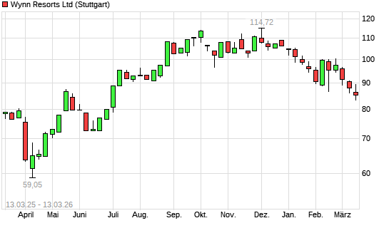 Mit dem Rücksetzer auf 85,57 EUR hat die Wynn Resorts-Aktie (ISIN US9831341071) am 12.03.2026 ein neues 6-Monats-Tief erreicht und damit den Kurs vom 13.02.2026 eingestellt.