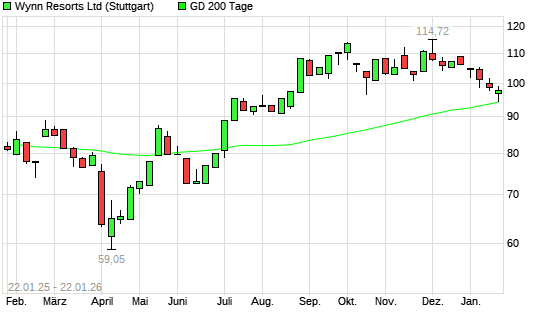 Mit dem Anstieg auf 97,37 EUR hat die Wynn Resorts-Aktie am 21.01.2026 die 200-Tage-Linie nach oben gekreuzt.