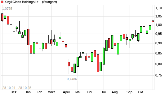 Mit dem Anstieg auf 1,03 EUR hat die XINYI GLASS HOLDING-Aktie (ISIN KYG9828G1082) am 27.10.2025 ein neues 6-Monats-Hoch erreicht und damit den Kurs vom 09.10.2025 eingestellt.