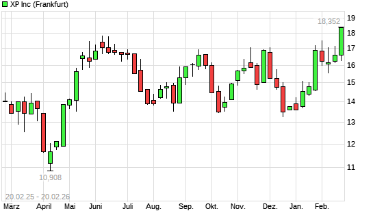 Mit dem Anstieg auf 18,02 EUR hat die XP-Aktie (ISIN KYG982391099) am 19.02.2026 ein neues 12-Monats-Hoch erreicht und damit den Kurs vom 11.06.2025 eingestellt.