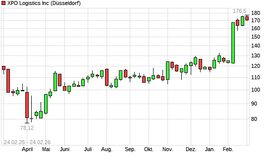 Mit dem Anstieg auf 175,60 EUR hat die XPO Logistics-Aktie (ISIN US9837931008) am 23.02.2026 ein neues All-Time-High erreicht und damit den Kurs vom 10.02.2026 eingestellt.