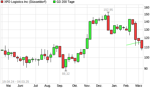 Mit dem Anstieg auf 117,60 EUR hat die XPO Logistics-Aktie am 03.03.2025 die 200-Tage-Linie nach oben gekreuzt.