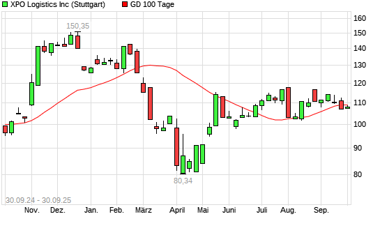 Mit dem Rücksetzer auf 107,20 EUR hat die XPO Logistics-Aktie am 29.09.2025 die 100-Tage-Linie nach unten gekreuzt.