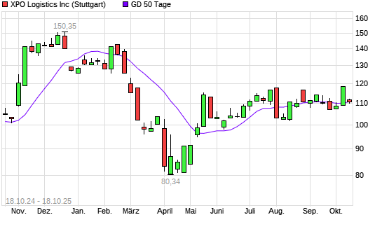 Mit dem Rücksetzer auf 110,40 EUR hat die XPO Logistics-Aktie am 17.10.2025 die 50-Tage-Linie nach unten gekreuzt.