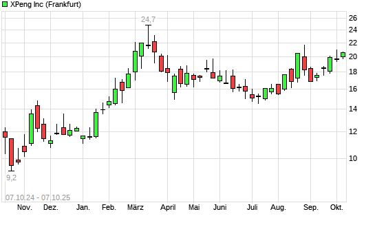 Mit dem Anstieg auf 20,70 EUR hat die XPeng-Aktie (ISIN US98422D1054) am 06.10.2025 ein neues 6-Monats-Hoch erreicht und damit den Kurs vom 02.10.2025 eingestellt.