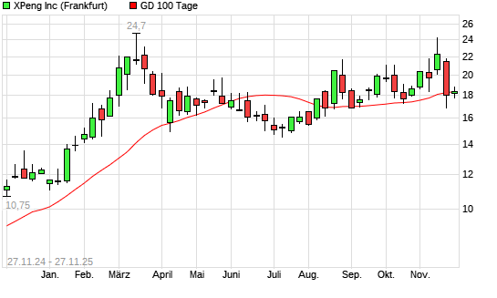 Mit dem Rücksetzer auf 18,35 EUR hat die XPeng-Aktie am 26.11.2025 die 100-Tage-Linie nach unten gekreuzt.