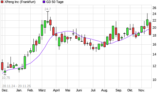 Mit dem Rücksetzer auf 18,40 EUR hat die XPeng-Aktie am 19.11.2025 die 50-Tage-Linie nach unten gekreuzt.