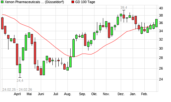 Mit dem Rücksetzer auf 35,60 EUR hat die Xenon Pharmaceuticals-Aktie am 23.02.2026 die 100-Tage-Linie nach unten gekreuzt.
