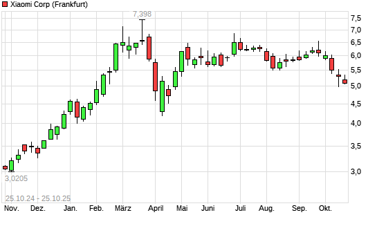 Mit dem Rücksetzer auf 5,10 EUR hat die Xiaomi-Aktie (ISIN KYG9830T1067) am 24.10.2025 ein neues 6-Monats-Tief erreicht und damit den Kurs vom 22.10.2025 eingestellt.