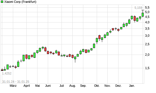 Mit dem Anstieg auf 5,12 EUR hat die Xiaomi-Aktie (ISIN KYG9830T1067) am 30.01.2025 ein neues All-Time-High erreicht und damit den Kurs vom 29.01.2025 eingestellt.