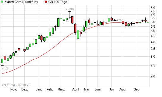 Mit dem Anstieg auf 6,09 EUR hat die Xiaomi-Aktie am 02.10.2025 die 100-Tage-Linie nach oben gekreuzt.