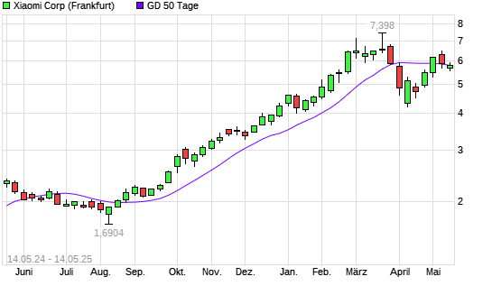 Mit dem Rücksetzer auf 5,67 EUR hat die Xiaomi-Aktie am 13.05.2025 die 50-Tage-Linie nach unten gekreuzt.