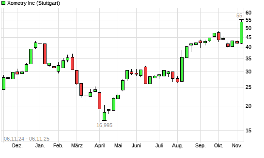 Mit dem Anstieg auf 54,00 EUR hat die Xometry-Aktie (ISIN US98423F1093) am 05.11.2025 ein neues 3-Jahres-Hoch erreicht und damit den Kurs vom 07.11.2022 eingestellt.