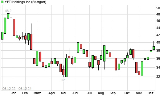Mit dem Anstieg auf 40,20 EUR hat die YETI Holdings-Aktie (ISIN US98585X1046) am 05.12.2024 ein neues 6-Monats-Hoch erreicht und damit den Kurs vom 07.06.2024 eingestellt.