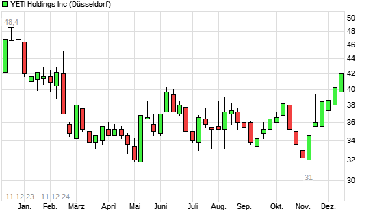 Mit dem Anstieg auf 40,80 EUR hat die YETI Holdings-Aktie (ISIN US98585X1046) am 10.12.2024 ein neues 6-Monats-Hoch erreicht und damit den Kurs vom 05.12.2024 eingestellt.