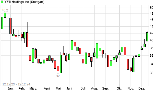 Mit dem Anstieg auf 41,20 EUR hat die YETI Holdings-Aktie (ISIN US98585X1046) am 11.12.2024 ein neues 6-Monats-Hoch erreicht und damit den Kurs vom 10.12.2024 eingestellt.