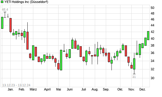 Mit dem Anstieg auf 42,00 EUR hat die YETI Holdings-Aktie (ISIN US98585X1046) am 12.12.2024 ein neues 6-Monats-Hoch erreicht und damit den Kurs vom 11.12.2024 eingestellt.
