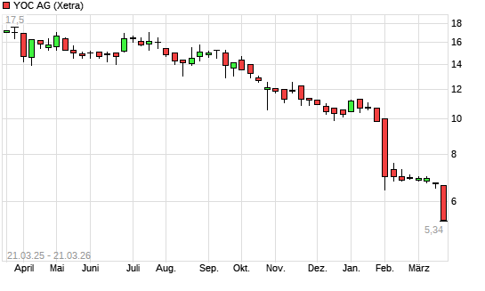 Mit dem Rücksetzer auf 5,22 EUR hat die YOC-Aktie (ISIN DE0005932735) am 20.03.2026 ein neues 5-Jahres-Tief erreicht und damit den Kurs vom 19.03.2026 eingestellt.