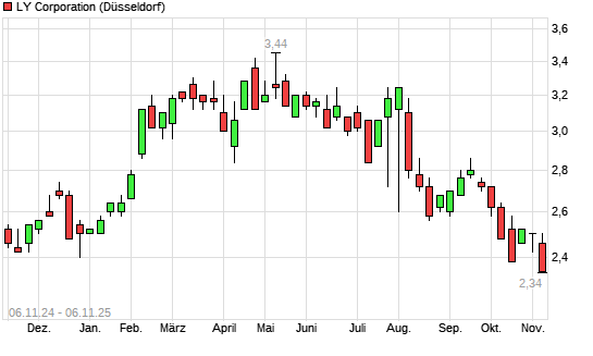Mit dem Rücksetzer auf 2,40 EUR hat die Yahoo Japan-Aktie (ISIN JP3933800009) am 05.11.2025 ein neues 12-Monats-Tief erreicht und damit den Kurs vom 29.10.2025 eingestellt.