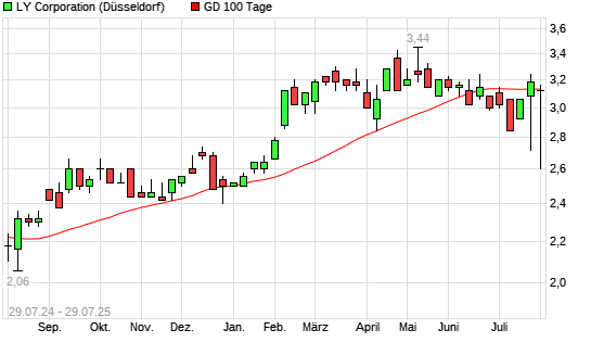 Mit dem Rücksetzer auf 3,12 EUR hat die Yahoo Japan-Aktie am 28.07.2025 die 100-Tage-Linie nach unten gekreuzt.