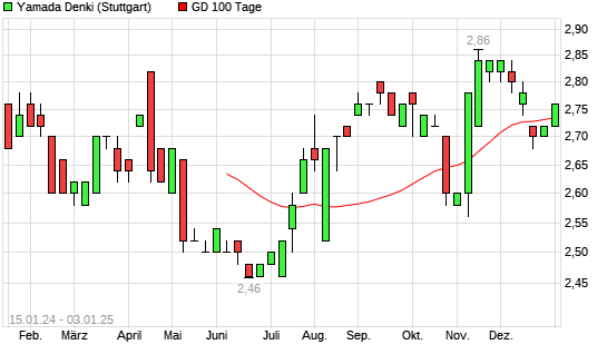 Mit dem Anstieg auf 2,74 EUR hat die Yamada Denki Holdings-Aktie am 02.01.2025 die 100-Tage-Linie nach oben gekreuzt.