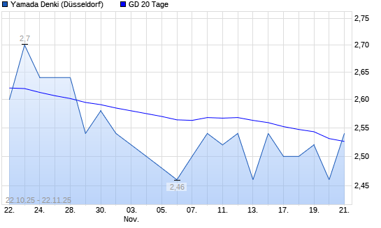 Mit dem Anstieg auf 2,56 EUR hat die Yamada Denki Holdings-Aktie am 21.11.2025 die 20-Tage-Linie nach oben gekreuzt.