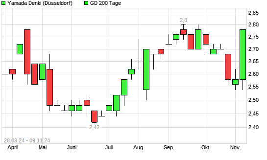 Mit dem Anstieg auf 2,78 EUR hat die Yamada Denki Holdings-Aktie am 08.11.2024 die 200-Tage-Linie nach oben gekreuzt.