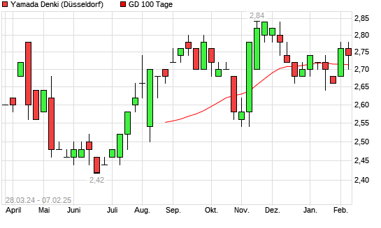 Mit dem Rücksetzer auf 2,72 EUR hat die Yamada Denki Holdings-Aktie am 06.02.2025 die 100-Tage-Linie nach unten gekreuzt.