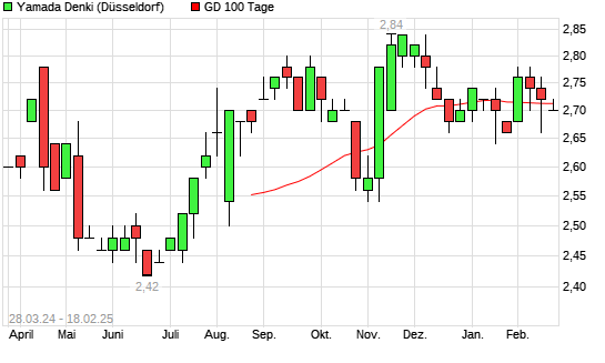 Mit dem Rücksetzer auf 2,72 EUR hat die Yamada Denki Holdings-Aktie am 17.02.2025 die 100-Tage-Linie nach unten gekreuzt.