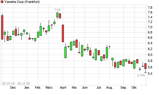 Mit dem Rücksetzer auf 5,44 EUR hat die Yamaha-Aktie (ISIN JP3942600002) am 29.10.2025 ein neues 10-Jahres-Tief erreicht und damit den Kurs vom 15.10.2025 eingestellt.