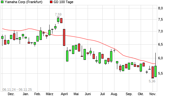 Mit dem Rücksetzer auf 5,77 EUR hat die Yamaha-Aktie am 05.11.2025 die 100-Tage-Linie nach unten gekreuzt.