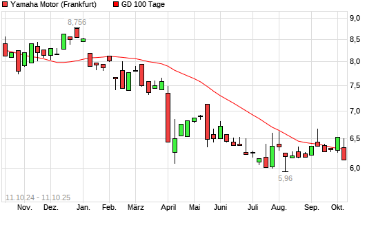 Mit dem Rücksetzer auf 6,14 EUR hat die Yamaha Motor-Aktie am 10.10.2025 die 100-Tage-Linie nach unten gekreuzt.