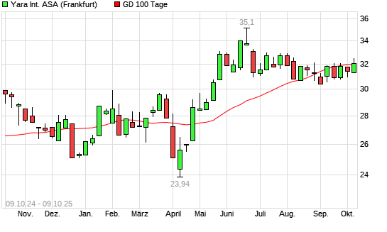 Mit dem Anstieg auf 32,50 EUR hat die Yara International-Aktie am 08.10.2025 die 100-Tage-Linie nach oben gekreuzt.