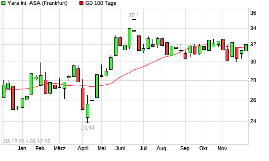 Mit dem Anstieg auf 32,05 EUR hat die Yara International-Aktie am 02.12.2025 die 100-Tage-Linie nach oben gekreuzt.