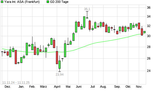 Mit dem Anstieg auf 30,62 EUR hat die Yara International-Aktie am 10.11.2025 die 200-Tage-Linie nach oben gekreuzt.