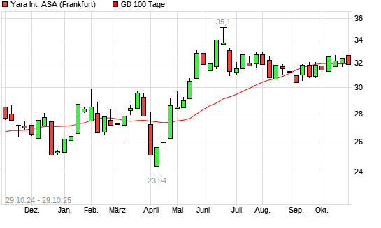 Mit dem Rücksetzer auf 31,88 EUR hat die Yara International-Aktie am 28.10.2025 die 100-Tage-Linie nach unten gekreuzt.