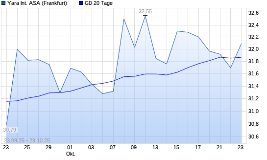 Mit dem Rücksetzer auf 31,70 EUR hat die Yara International-Aktie am 22.10.2025 die 20-Tage-Linie nach unten gekreuzt.