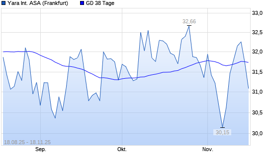 Mit dem Rücksetzer auf 31,73 EUR hat die Yara International-Aktie am 17.11.2025 die 38-Tage-Linie nach unten gekreuzt.