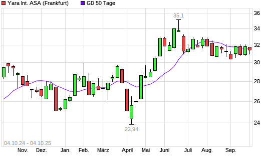 Mit dem Rücksetzer auf 31,43 EUR hat die Yara International-Aktie am 03.10.2025 die 50-Tage-Linie nach unten gekreuzt.