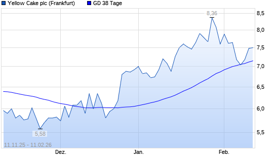 Mit dem Anstieg auf 7,48 EUR hat die Yellow Cake-Aktie am 10.02.2026 die 38-Tage-Linie nach oben gekreuzt.Die Yellow Cake-Aktie befindet sich seit dem 26.11.2025 im ...weiterlesen