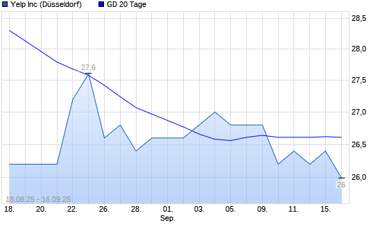 Mit dem Rücksetzer auf 26,20 EUR hat die Yelp-Aktie am 15.09.2025 die 20-Tage-Linie nach unten gekreuzt.