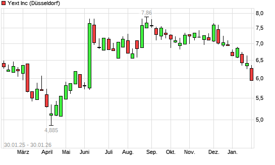 Mit dem Rücksetzer auf 5,95 EUR hat die Yext-Aktie (ISIN US98585N1063) am 29.01.2026 ein neues 6-Monats-Tief erreicht und damit den Kurs vom 28.01.2026 eingestellt.